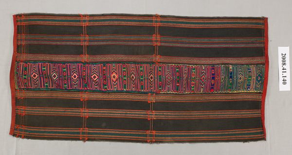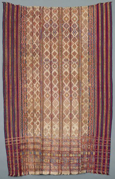 Editor: Here we have a "Ceremonial Textile," or "Chagsi Pangkheb," created around the early 20th century. It's currently housed here at the Minneapolis Institute of Art, comprised of fiber art, including silk and cotton weaving. It really strikes me as a sophisticated geometric abstraction. What stands out to you from a formalist perspective? Curator: Immediately, the symmetrical composition compels my attention, along with the intricate patterns meticulously woven. Consider how the central diamond motif serves as a focal point, balanced by the flanking vertical panels with their differing yet harmonizing designs. The varying textures, arising from the weave itself and perhaps additional embroidery, are vital too. Editor: The patterns are really dense; almost dizzying with repetition! It's so methodical; how do you break down all these visual components? Curator: Method is precisely the right word. Attend to the structural organization: horizontal bands grounding the composition and subdividing the vertical columns. Observe the interplay of positive and negative space created by the interwoven shapes. The colours, subtle yet distinct, define forms and rhythms. Ask yourself: what kind of relationship exists between the bands and the geometry inside the composition? How is the surface articulated with tone, texture and mark? Editor: I see the dialogue between colors and the relationships they establish, but why focus solely on what's inside the borders of the textile itself? Can't we think about how it was used? Curator: Contextual analysis undoubtedly holds merit. However, a formalist reading prioritizes the internal logic of the artwork. How line, shape, color, and texture coalesce to form meaning through its inherent visual language. By bracketing out external influences, we encounter the very essence of design. Editor: I suppose there's a real purity in studying just what's visually present and how it interacts. It feels much more…contained somehow. Curator: Precisely. Focusing on pure form gives rise to understanding that will necessarily exist independent of extrinsic factors like cultural norms. Editor: That's a really illuminating lens. I feel like I’m really beginning to appreciate all the work that goes into analyzing the design elements themselves.