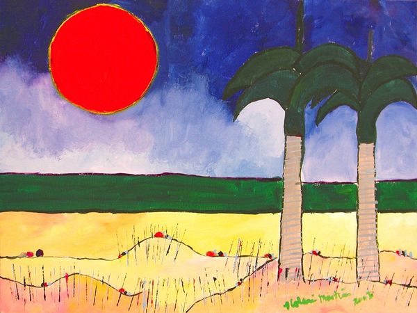 Aldemir Martins created "Paisagem" with bold brushstrokes and a vivid palette. The composition is defined by distinct horizontal bands: a deep blue sky, a bright yellow sun, a pale horizon line, and an earth of yellows and greens. Martins simplifies natural forms into essential shapes. The sun, a perfect orb, dominates the sky, suggesting not just light but a symbolic presence. The landscape below is abstracted. The artist uses color to define form, rather than traditional shading. This abstraction, combined with the flatness of the picture plane, moves the painting away from realism, towards a more conceptual representation of landscape. The painting challenges our perception of space, suggesting a world where color and form are not merely descriptive but carry their own weight. We are left to contemplate the interplay between the real and the represented.