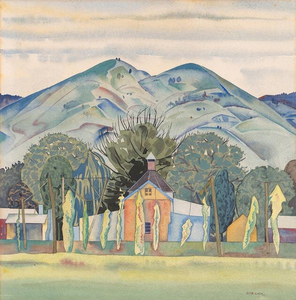 Editor: This is Dora Carrington's "Farm at Watendlath," held at the Tate. The buildings and landscape feel very solid and present. What do you make of it? Curator: I see a conscious negotiation with traditional landscape painting. Carrington, living in a patriarchal society, uses the domestic space to question the romanticised view of rural life. The almost oppressive green hills box the farm in, hinting at the limitations placed on women. Editor: So, the landscape isn't just a backdrop, but a commentary on societal constraints? Curator: Precisely. The flattened perspective and simplified forms further emphasize this sense of confinement, challenging conventional notions of feminine domesticity and freedom. Editor: I never would have considered it that way. Thanks for pointing that out. Curator: Art can be a powerful means of revealing uncomfortable truths, and that’s something to keep in mind.