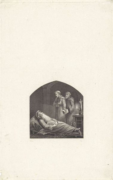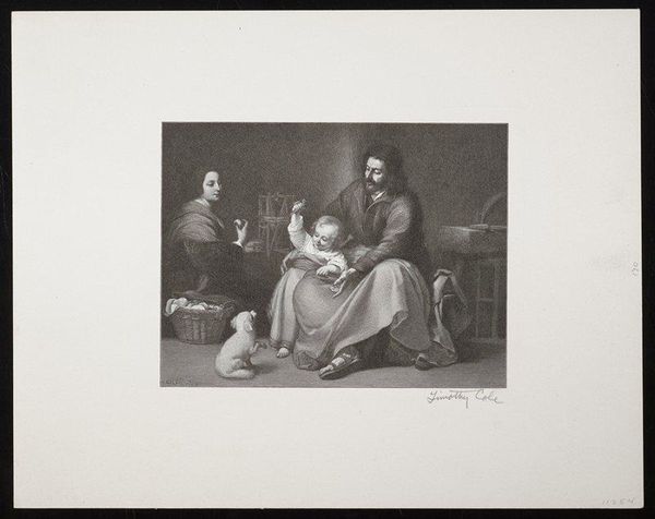 Editor: We're looking at "The Charitable Child" by Jean Charles Bienvenu Gaspard Thévenin, at the Harvard Art Museums. It has a very somber mood, with an angel in the scene. What can you tell me about it? Curator: Note the interplay of light and shadow, and the composition's reliance on stark contrasts. Observe how the artist uses these to direct our gaze, creating a visual hierarchy. The arrangement of figures—the charitable embrace, the angel's gesture—creates a complex narrative within the frame, doesn't it? Editor: It does seem to tell a story. It is a little hard to read without color, but these stark contrasts create a striking image. Curator: Precisely. Stripping away color allows us to appreciate the skeletal structure of the image and how it resonates through careful manipulation of values. It highlights the inherent formalism and its potential for visual storytelling. Editor: I see it now; thanks!