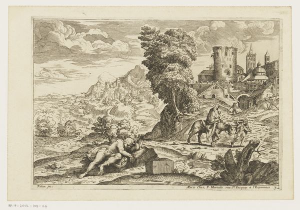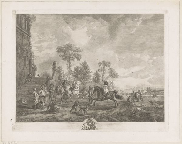 Editor: Here we have "Rivierlandschap in de Levant," a 1760 engraving by Jacques Aliamet, currently held at the Rijksmuseum. It has such a gentle, almost romantic feel, with this detailed depiction of figures along a riverbank. How would you interpret the context around an image like this? Curator: Well, immediately I'm drawn to the title. "Levant" wasn't just a geographical location, it was a loaded term in 18th century Europe. It represents a fascination, often a very skewed one, with the 'Orient.' Aliamet likely never saw this place. This idealized vision speaks volumes about European perceptions and power dynamics at the time, wouldn't you say? Editor: That's fascinating! So, the print is less about accurate representation and more about constructing a European fantasy of this region? Curator: Precisely. Notice the details – the classical ruins, the somewhat staged interactions of the figures. It all contributes to this image of a timeless, almost idyllic Levant. And prints like these circulated widely, shaping popular imagination. Editor: And influencing policy, even? If these kinds of imagery reinforced the idea of this exotic, ‘timeless’ Levant, surely there were those at the time ready to intervene in it. Curator: Exactly. Images always operate within political landscapes. The popularity of these idyllic images helped fuel colonial aspirations by positioning European intervention as modernizing. The picturesque disguises power. Editor: That’s sobering. So a seemingly harmless landscape can be implicated in broader structures of power and control? Curator: Absolutely. It urges us to look critically at the cultural narratives these artworks perpetuate. Next time you look at similar pieces, consider what narratives and power structures the piece invokes. Editor: Thank you, that really opened my eyes! Curator: My pleasure. Understanding the social and political context unlocks a richer understanding.