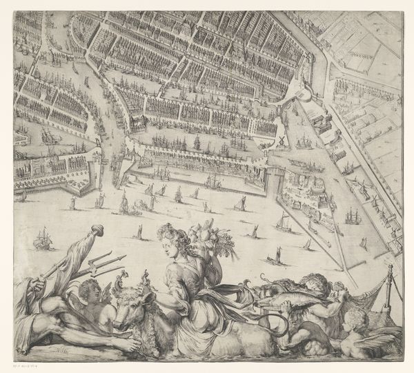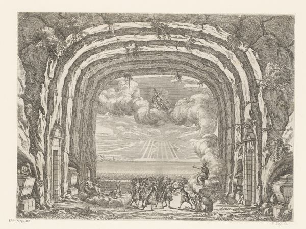 Editor: This engraving, dating back to 1654, presents Giacomo Torelli da Fano’s design for the ballet "Les Noces de Thétis". The sheer depth he creates with the cavernous setting is mesmerizing! What symbolic weight does this scene carry? Curator: The theatrical design reveals a fascinating interplay of mythological, political, and personal symbolism. The marriage of Thetis, a sea nymph, evokes the power and fertility of the ocean, a force often aligned with the monarchy in baroque spectacle. What do you notice about the perspective and architecture? Editor: It’s almost overwhelming! The eye is drawn into this seemingly endless tunnel, and the rough texture of the cave walls contrasts sharply with the precise, almost classical, doorways on either side. Curator: Precisely! The tunnel can be seen as a pathway, even a womb of sorts, leading to transformation and renewal, which aligns with the wedding theme, right? The classically inspired doorways suggest order and civilization attempting to contain the wild, untamed forces of nature. Look closely: there is a mechanical cart upon which some sort of symbolic, crowning God arrives. Does this figure seem integrated, or separate? Editor: Definitely separate. It’s like a spectacle within a spectacle, highlighting artifice even in this naturalistic setting. The centaur and the dancing figures feel different than the looming structure in scale and in tone. Curator: That's perceptive. Torelli used this juxtaposition to highlight the complex layers of meaning embedded within the ballet, but what does that choice say about this period and these people? This cart-God and formal garden, appearing distantly and formally, emphasizes that human actions are under the domain of a powerful deity. The cultural memory suggests that they are never fully released from the will of divine judgement, which is the purpose of performance to celebrate! Editor: This really does add so many new layers to my understanding. I hadn't considered how the design itself communicates meaning! Curator: Indeed. Visual imagery is like cultural DNA, constantly evolving yet still echoing with the wisdom and anxieties of previous eras.