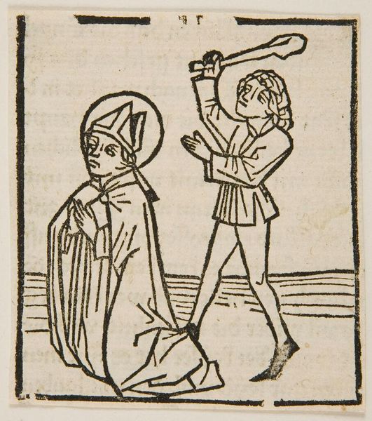 Editor: This is a woodcut illustration from Voragine's "Leben der Heiligen," printed in Augsburg in 1475. It depicts a beheading, and the stark black and white imagery is quite striking. What symbols do you see at play here? Curator: Notice the halo – a visual cue instantly marking sanctity, even amidst violence. Consider also the executioner’s averted gaze; it speaks volumes about the psychological weight of such acts, and how societies grapple with sanctioned violence. Editor: So, the halo provides immediate context, while the executioner adds a layer of human complexity? Curator: Precisely. These recurring motifs help solidify collective memory and understanding across generations. Do you see how the woodcut, through its symbols, reinforces the power and the horror of martyrdom? Editor: It's fascinating how much information is conveyed through these stark visual elements. Curator: Indeed, the image resonates through time because of the symbolic power it wields.