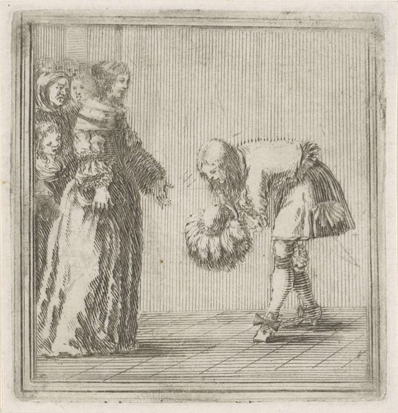 Curator: Look closely at "Facetious Inventions of Love and War" by François Collignon, a small engraving, just a few inches square. Editor: My first thought is… awkward. There’s a strange formality clashing with these exaggerated features. It's like a royal court of caricatures. Curator: Exactly! The artist plays with the conventions of portraiture, amplifying features into grotesque comedy. Note the fine lines, the meticulous detail given to their ridiculous costumes. Editor: The composition is stark, isolating them against this minimalist landscape. It draws all the attention to their figures and their… imperfections. I find it fascinating how it uses starkness to heighten the impact. Curator: It's a satire, a commentary on the vanities of love and the absurdities of conflict, condensed into a tiny, potent visual joke. Editor: It's a dark humor, though. Makes you wonder what Collignon was really thinking about relationships and power. Curator: Yes, it leaves you pondering the human condition. Editor: A thought-provoking miniature.