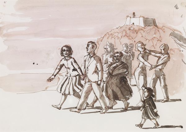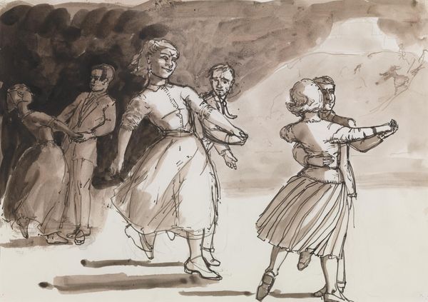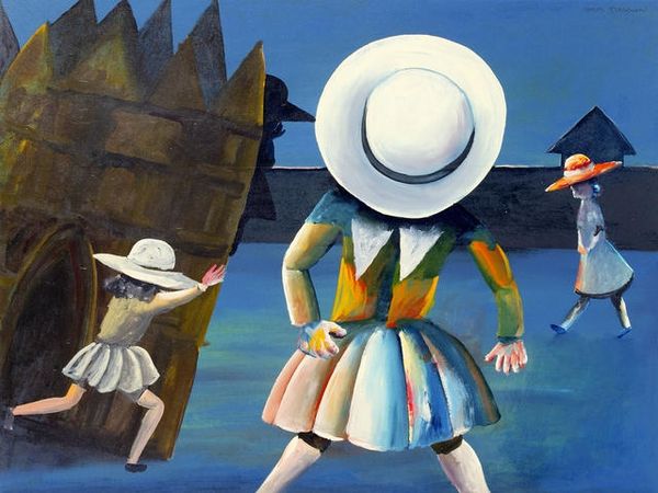 Editor: Paula Rego’s enigmatic painting, "The Dance," captures a nocturnal scene, and the figures seem frozen, caught between joy and something more unsettling. What’s your interpretation of this spectral dance? Curator: It feels deeply personal, doesn't it? Like Rego's conjuring a memory, or perhaps a collective dream, thick with secrets. Notice how the moon hangs heavy, almost judging, and the dancers' faces – so individual, yet unified in their solemnity. What do you feel from their expressions? Editor: They seem haunted, maybe resigned? But I love the costumes, they give it an older world feel. Curator: Exactly! The past isn’t neatly packaged away; it dances with us, influencing every step. I love how she mixes the everyday with the mythical. A Portuguese folk tale perhaps, re-imagined? Editor: I never thought about how it might tie into Portuguese folklore. Curator: Art's a conversation, isn’t it? We bring our own baggage to the dance floor, just like Rego did.