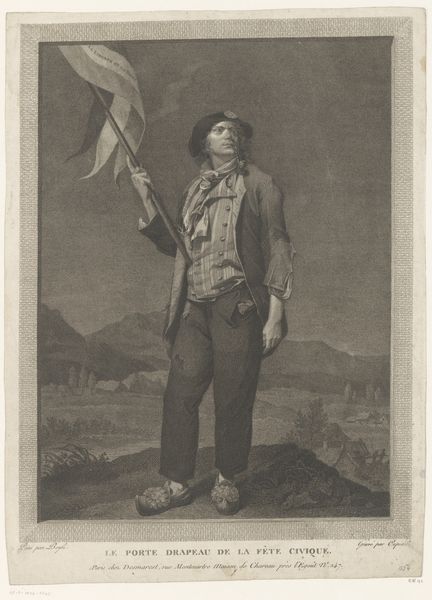 Editor: So, this is Louis-Léopold Boilly's "Portrait du chanteur Simon Chenard" from 1792, oil on canvas. He looks like a revolutionary! What strikes me is the hopeful upward gaze despite the dark, almost stormy backdrop. What symbols do you see at play here? Curator: Immediately, I'm drawn to the tricolor flag. The colors themselves became powerful symbols – liberty, equality, fraternity. Note how Chenard clutches the standard, but also the pipe, referencing contemplation and the life of the mind during a time of action. It suggests this revolution wasn't simply brute force. Editor: The pipe... interesting! So it’s not just about revolutionary action. What else do you read from the composition? Curator: Observe his clothing, it isn't overtly aristocratic nor traditionally militant, signifying 'the common man' rising. But isn't it intriguing how his upward gaze, combined with the rather turbulent sky, hints at the uncertainty, the idealism, even the potential dangers inherent in revolution? What future does his upward glance portend, do you think? Editor: I see that. He seems to embody both hope and trepidation at such an important moment in time. He seems pensive! Almost unsure, not just a blindly zealous figure. Curator: Exactly! This makes Chenard's image profoundly human. Beyond historical record, it reflects the complex emotional and psychological landscape of a people undergoing immense change. The artist captures an individual navigating a world where long-held meanings are being violently upended and newly redefined. Editor: This has made me appreciate how portraiture can offer multiple narratives! The subject isn't a figure of unyielding triumph, but of thoughtful, even cautious hope. Curator: Indeed. We've only scratched the surface; visual language continues to reverberate through our cultural memory. Every detail bears deeper study!
