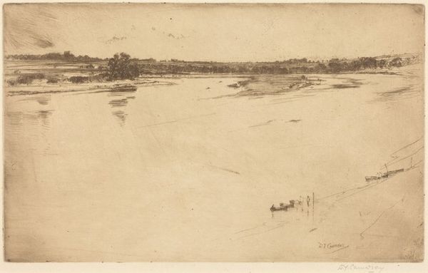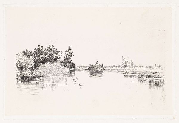 Editor: Here we have Elias Stark's "Bruggetje over een sloot," a print made with etching, likely between 1859 and 1908, housed at the Rijksmuseum. It’s quite delicate, almost dreamlike. What draws your attention when you look at this piece? Curator: What strikes me is the quietness, almost the deliberate ordinariness. Stark isn't trying to glorify nature or create a dramatic scene. He’s showing us the everyday, the mundane. But what does it mean to represent the mundane? It prompts questions about who has the privilege to see the world this way. Was this accessibility available for everyone at this time? Editor: That’s an interesting point. It seems like a very personal observation, not necessarily intended for public display. Curator: Exactly. This image prompts a consideration of class and access to leisure, reflecting on who had the time and resources to contemplate the subtle beauty of the Dutch landscape, and how art either reinforces or challenges those social structures. The bridge, while seemingly simple, connects to larger societal implications around land ownership and access. Editor: So you're saying this landscape, in its simplicity, speaks volumes about the social context of the time? Curator: Absolutely. The etching itself becomes a document, quietly revealing power dynamics and the selective vision of art history. Considering the late 19th-century context, where industrialization was rapidly transforming the landscape and displacing rural communities, this idyllic scene could be interpreted as either a nostalgic yearning for a disappearing way of life or a form of escapism for a privileged class. How might contemporary artists respond to such a scene today? Editor: I guess I hadn't considered those wider implications before, seeing just a simple bridge and stream. Thank you. Curator: Precisely. Art invites us to consider the world, not as it seems on the surface, but how its representation is woven into the complex fabric of history and society. Editor: It definitely gives a new perspective to seemingly ordinary artworks.