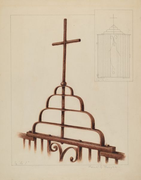 Manuel G. Runyan made this rendering of a cross at an unknown date using what looks like pencil and watercolor on paper. The palette is mostly restrained earth tones, but it’s the kind of restraint that lets the lines and forms speak volumes. Look at the bottom; see how the watercolor almost stains the paper, creating this sense of depth? It's like Runyan is embracing the materiality of his medium, making the paper itself a part of the statement. The way the cross rises from its base, almost weightless, is beautifully done. I’m drawn to the curls at the base. They have a sense of playful elegance, almost like a signature. And those vertical lines beneath? They’re not just supports; they’re like roots, grounding the whole piece in something solid and real. This reminds me a bit of Guston’s later work, where he moved away from abstraction but with this piece there’s a focus on simplicity and directness. It's an interesting take on the cross, a symbol that’s been interpreted in countless ways, but here, it feels deeply personal and handmade.