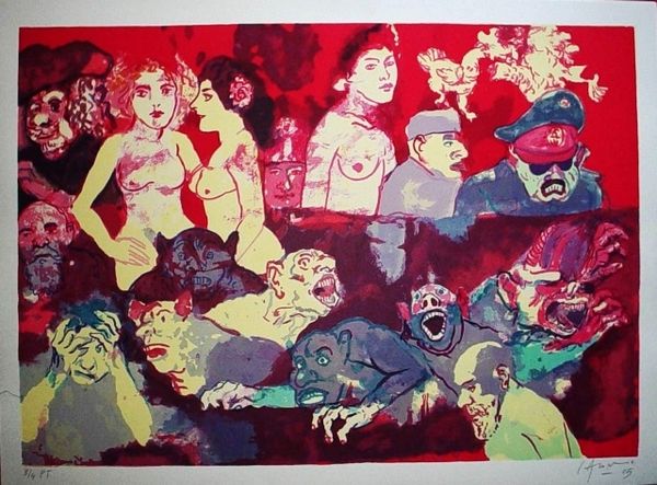 Robert Sammelin made this ‘Creepshow T-shirt Design’ sometime in the 20th century, presumably with digital painting tools. It's not a medium I'm totally comfortable with, but what strikes me is the energy it has. The way the colors pop, especially that vibrant red, it’s like a scream on fabric. Looking closely, you can see how Sammelin layers blues and purples to create depth in the figures, especially that central, terrified character. The highlights are sharp, almost like light reflecting off wet skin, or maybe it's the sweat of fear. The way the blacks are used is interesting – they're not just background, they’re active participants, shaping the space around the figures, making it feel claustrophobic, like the walls are closing in. It reminds me a little of early comic art, or maybe even some of those old horror movie posters. But Sammelin brings a contemporary sensibility to it, a certain graphic punch that feels very now. Art's always a conversation, right? We're all just riffing off each other, trying to make something new out of something old, and having fun along the way.
