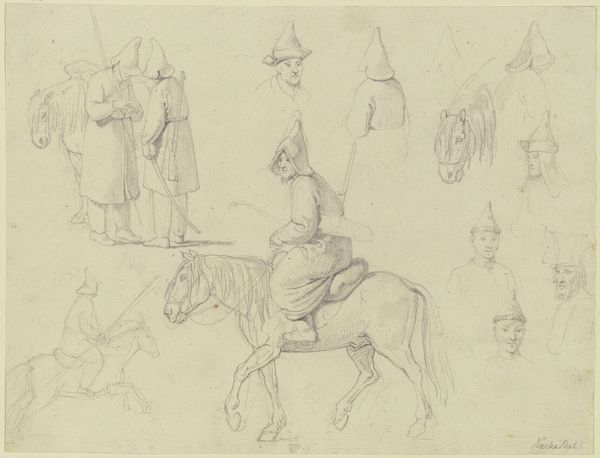 Curator: This pencil drawing, “Ruiter en honden naar Adriaen van de Velde en Jacob van Ruysdael”, by Johannes Tavenraat, was created between 1840 and 1846. What strikes you first about this work? Editor: The sketch-like quality immediately draws my attention. The artist seems to have captured a fleeting moment, a brief encounter. Curator: Absolutely, Tavenraat's academic style highlights a specific practice – the creation of studies and copies of existing works to improve skills in workshops. The presence of annotations suggests that the image served as a resource. Editor: It makes me wonder about the choice of imagery here, beyond skill-building. The central figure, a horseman with a hunting bird, evokes a sense of aristocracy and perhaps a lost, idealized past, as we often see during Romanticism. The dogs contribute to the image as symbols of fidelity. Curator: Yes, we must think about consumption patterns: Who would request copies after Adriaen van de Velde, to adorn which space and serve what societal need? The drawing offers information about class, societal taste, but also about the labor involved in the workshop’s drawing process. Editor: The repeated dog figures are quite fascinating. It’s as if Tavenraat is experimenting with their poses and movement, capturing different aspects of their animal nature in his sketch, and, consequently, how dogs relate to men in visual arts. Curator: And we cannot forget to examine Tavenraat's own materials – the type of pencil, the paper, how readily available and expensive these materials would have been, as well as how easy this sketch was to reproduce. These practical elements really informed the possibilities open to a 19th-century artist working in his milieu. Editor: Considering its function as a sketch, it offers some insight into the values attached to particular artistic representations at the time. We see, embodied here, ideas around wealth, fidelity, and idealized historical themes, revealing a fascinating web of meaning embedded within a seemingly simple practice piece. Curator: Precisely. Looking at this drawing reminds me that we must never neglect the mundane aspects of materials when unraveling art history, which otherwise would be romanticized.