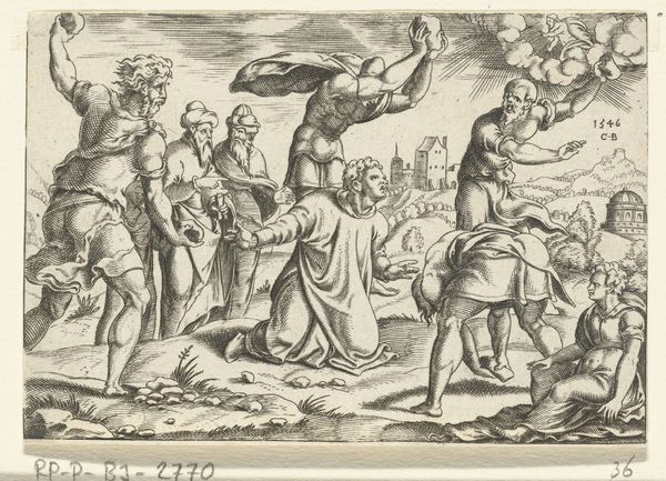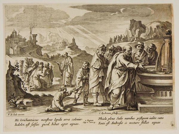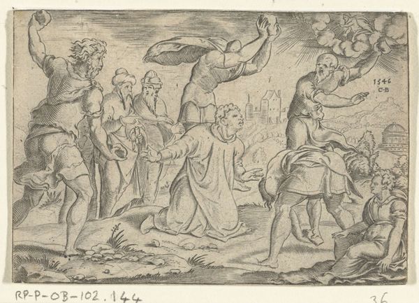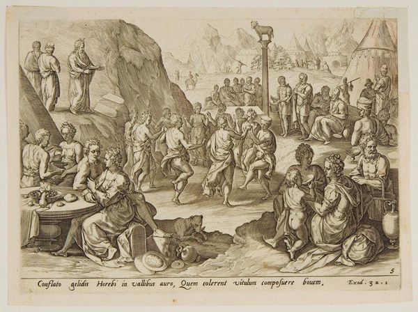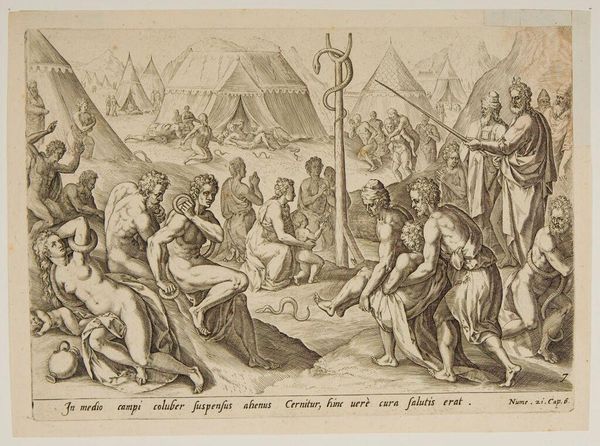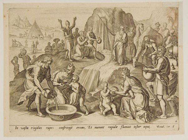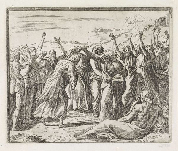 Curator: Johann Sadeler I, who lived from 1550 to 1601, created this detailed scene entitled "Israelites Leaving Egypt." Editor: What immediately strikes me is the incredible density of figures—a mass exodus rendered in fine lines, yet conveying a palpable sense of movement. Curator: Absolutely, and consider the social implications: the Israelites' departure isn't just a religious narrative; it’s about freedom from oppression, a symbol of liberation for marginalized communities throughout history. Each figure, burdened with belongings, represents a break from enslavement. Editor: Yes, and if we examine the composition, notice how the artist uses linear perspective to guide our eye. The receding figures, the landscape, and the textural variations create depth, emphasizing the scale of this pivotal moment. Curator: And looking closer, we see hints of potential conflict: the armaments carried by some figures suggesting an anticipation of resistance. Editor: The light and shadow create an almost turbulent mood, fitting for a scene of this magnitude. Curator: It's a testament to Sadeler's skill that he could convey such complexity in a single image. Editor: Indeed, a masterclass in rendering form and narrative tension through careful line work.
