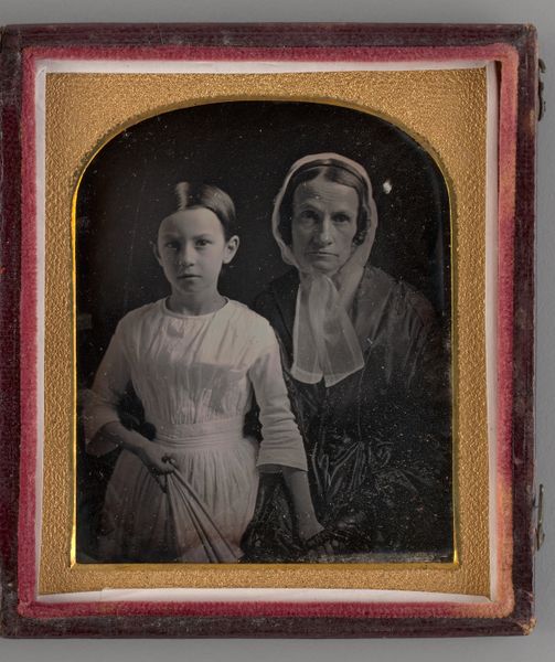 Curator: This daguerreotype from 1855, presently known as "Untitled (Portrait of a Woman and a Boy)," captures a quiet moment between mother and child. Editor: My first impression is the intensity in their gazes, especially the boy. It's arresting and a little unsettling; those floral decorations feel almost like forced festivity, adding to that strange air. Curator: It’s fascinating how this type of portraiture became a widespread cultural phenomenon during the mid-19th century, offering middle-class families access to image-making in ways previously exclusive to the elite who commissioned painted portraits. Editor: And it makes me consider the symbolism loaded into such a static and deliberate image. What did it mean to freeze a moment in this way, especially for a mother and son? The flowers held by the boy—symbols of life, growth, maybe remembrance depending on their type. Does it commemorate an occasion, or perhaps signal mourning, or perhaps a hopeful image meant to contrast a past illness. Curator: Exactly. The cultural expectations and the rituals surrounding mourning practices during this time were significant. There's a stillness and solemnity here that reflects that era, regardless of its initial intent. One must not underestimate the context of social and public bereavement back then. It changed quite a bit the purpose of commissioning family portraits. Editor: Consider also that he’s draped in florals while her patterned shawl might invoke protection or even domestic confinement. She is central in the shot, seated, seemingly unsmiling while her look conveys power. What a fascinating visual relationship here between her, her son, and the many associated layers! Curator: It's important to acknowledge how this new form of representation influenced notions of beauty and status. This portrait provides a rare glimpse into how people sought to represent themselves in the face of evolving social landscapes. They want to be memorialized following the codes of the time. Editor: Looking at it, I’m now left pondering how a single image can encapsulate an entire world of hidden signs and messages and invite us into speculation about their life, or simply the intention that generated it. It leaves an haunting effect, nonetheless. Curator: I'm left to ponder how daguerreotypes became these powerful vehicles for expressing aspiration and documenting the individual experience within shifting cultural norms, now forever frozen in time, thanks to this medium.