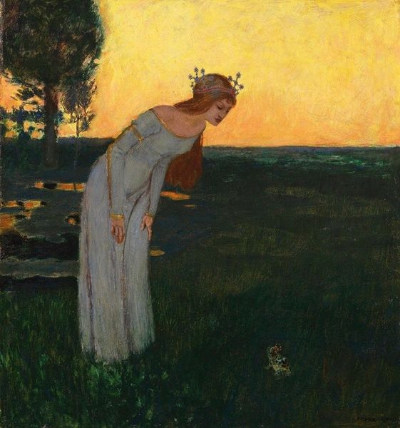 Editor: This oil painting, titled "Nymphs In The Forest," is by Joan Brull. It depicts two female figures in a landscape, and it's strikingly ethereal; there's almost a dreamlike quality to the scene. How do you interpret this work? Curator: Let us observe how the artist utilizes formal elements to construct this 'dreamlike quality' you mention. Notice the muted palette, dominated by blues and browns. The impasto is thinly applied, creating soft edges. These elements contribute to the image's sense of otherworldliness. Does this suggest anything to you? Editor: Perhaps the subdued colours create an atmosphere of mystery, like it is hiding its secrets. Curator: Precisely! The figures themselves, elongated and barely defined, blend seamlessly with the environment. The composition leads your eye from the figures on the left, across the body of water towards the implied horizon line. Note how Brull does not offer sharp contours. These formal decisions emphasize the intangible, the fleeting nature of the nymphs themselves. Do you see how the structure mirrors and bolsters the painting's theme? Editor: I do. The indistinct figures and colours mirror the ephemeral nature of the nymphs themselves, really emphasising them as more than human. Thank you for the lesson! Curator: The pleasure was mine. Consider, going forward, how the elements of form underpin and reinforce thematic content within an artwork. It is through structure that a piece is unlocked.