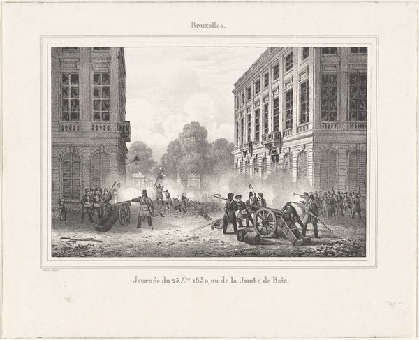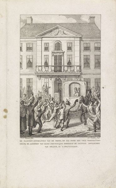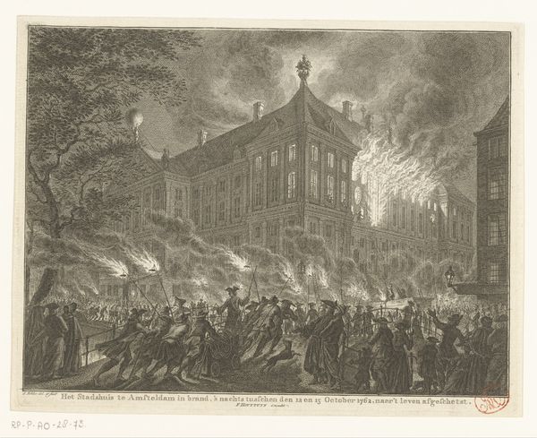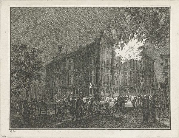 Editor: This engraving by Théodore Fourmois, titled "Plundering van het huis van Libry-Bagnano, 1830," captures a chaotic scene. It's hard to miss the feeling of unrest and almost frenzied activity in the etching. I'm wondering, what social narrative do you think Fourmois is trying to express in this historical context? Curator: The work's socio-political undertones are quite palpable. It illustrates the plundering of Libry-Bagnano's house during the 1830 revolution, which resulted in the separation of the Southern Netherlands from the Northern Netherlands. Its original context as a print also informs how we perceive the event: was it made to criticize or glorify these events? Editor: That's a key point I hadn't considered. How might the medium of print, specifically etching, affect the artwork's message and public perception? Curator: As an easily reproduced image, the print would have been instrumental in disseminating a particular interpretation of these events, whether as propaganda, historical record, or social critique. Notice the artist's emphasis on the mob, suggesting a particular sympathy, and perhaps aligning the artist with their actions and motives. How do you feel it affects your interpretation knowing that this piece now hangs in the Rijksmuseum? Editor: Knowing that it resides in the Rijksmuseum gives it an elevated historical importance, and places the depicted unrest safely in the past. I almost wish it still carried a bit of its original "agitprop" feeling, removed from its initial context! Curator: Yes, it’s interesting to consider how institutional display changes the meaning and potency of a work originally conceived in a moment of revolution. Something meant to agitate can become a memento in a public collection, viewed and studied from different perspectives.