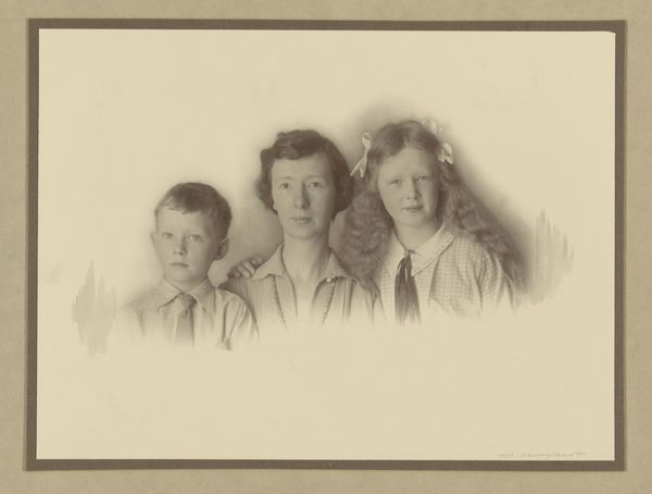 Editor: Here we have a photograph entitled "Portret van drie onbekende kinderen," or "Portrait of three unknown children" by Edouard Potterat, possibly from 1898. The sepia tone and the children's serious expressions give it a somewhat melancholic air. How do you interpret this work? Curator: What strikes me is how staged it appears. Group portraits in the late 19th century were powerful tools in constructing social narratives, particularly around class and gender. How do their clothes speak to you? Notice the contrast between the children's attire and the plain backdrop. Editor: Yes, I see that. The older girl has a detailed dress, while the other two wear simpler clothing. Curator: Exactly. This variance is very calculated. Photographs like these can be seen as performative assertions of identity and status. The children are unknown to us, but their representation communicates particular ideals about childhood, family, and social standing at the time. It speaks volumes about how one wished to be perceived, doesn't it? How do you think a contemporary viewer might react to this image, compared to its original audience? Editor: I think a modern audience might find the formality a bit strange, perhaps even unsettling, given our contemporary ideas about childhood innocence and spontaneity. Curator: Precisely! We are conditioned by our own socio-political lens to analyze visuals through very different ideologies. So we should use art history to develop empathy when seeing artifacts from very different contexts. Editor: That’s fascinating. I’ve never really considered how constructed these early photographs could be, reflecting specific cultural values. Thank you for highlighting this dimension. Curator: It’s all about peeling back the layers to understand what the image *wants* to say.