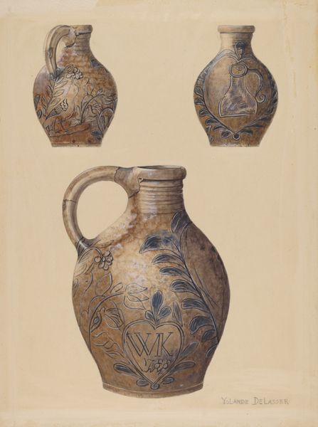 Nicholas Amantea made this drawing of a jug, we don't know exactly when, using watercolour and graphite. Look closely, and you can see the care taken in rendering the texture of the jug's surface, the stippled effect achieved with graphite, which mimics the rough, porous quality of the ceramic. The blue floral design seems to float on the surface, adding a touch of whimsy to the otherwise utilitarian object. Notice how the artist uses a limited palette, mainly shades of grey and blue, but the subtle variations within these colours bring the jug to life. The handle on the smaller jug seems like an afterthought, like a doodle. But then again, the whole image has that loose, informal quality. It reminds me a bit of Fairfield Porter's still lifes. But maybe that's just me! Anyway, it's these kinds of quiet, unassuming works that really get my attention these days.
