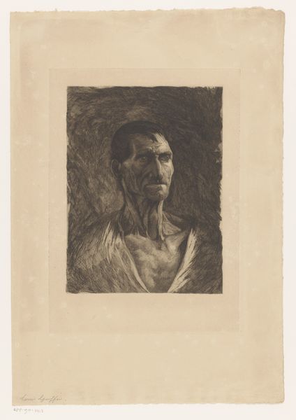 Joseph Dujardin created this print, "Portret van een onbekende oude vrouw," using etching techniques. Dujardin invites us to consider the lived reality of an aging woman, whose identity remains unknown to us. The details etched into her face speak volumes—deep wrinkles, a sign of life etched by time and experience. Her aged face invites reflection on the experiences and societal forces which shaped her life. The image transcends conventional beauty standards, offering a perspective on aging that is both dignified and raw. The lines and shadows Dujardin etches are not merely representations of age; they are a narrative of survival, resilience, and endurance. This work challenges us to recognize the value and depth inherent in every face, regardless of age or social status. It's an intimate study, prompting us to consider the untold stories and quiet strength of those often overlooked by history.