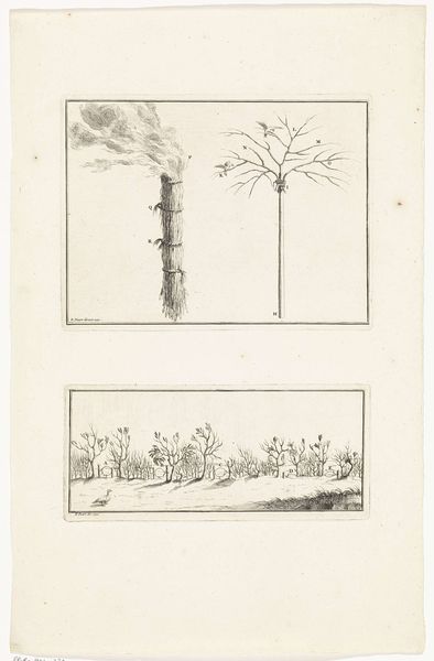 This is "Dierenvallen" or Animal Traps, an etching by Bernard Picart from the early 18th century. Here, the artist illustrates various methods for trapping animals, depicting snares and pitfalls set amidst serene landscapes. These scenes echo the age-old dance between humanity and nature, where survival often meant asserting dominance over the animal kingdom. The traps themselves serve as potent symbols, not just of human ingenuity but also of our primal instincts. Consider the recurring image of the noose—a simple loop that signifies control, restraint, and, ultimately, death. This motif echoes through time, from ancient hunting rituals to modern-day symbols of power and oppression. Its presence taps into our collective memory, stirring subconscious associations with vulnerability, dominance, and the precarious balance of life. The emotional resonance of this image lies in its quiet depiction of an active scene. It subtly reminds us of the hidden currents of our own nature, the ever-present tension between the hunter and the hunted, playing out in the theater of the natural world.