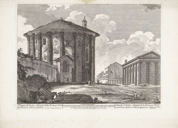 Curator: Here we have Jean Barbault's "View of the Basilica di San Lorenzo fuori le Mura in Rome," created in 1761 using etching and engraving techniques. Editor: My first impression is of a faded dream, captured in exquisite detail. It's melancholic, almost ghostly, despite depicting a clearly monumental architectural subject. Curator: Barbault, working within the tradition of vedute, meticulously renders the Basilica's facade, capturing the texture of the stone and the play of light across its surface. The social context here is crucial: prints like this were widely distributed, contributing to the 18th-century's fascination with Rome's ancient and Christian heritage. Editor: Yes, I feel like I'm holding a memory of Rome in my hands, not Rome itself. The artist’s choice of line, especially, evokes a feeling of looking into the past, when line engraving was a prevalent way of documenting. See, for example, those clouds, those meticulous stones in the church wall! And yet, it also brings forward the monumentality of Rome. Curator: Absolutely, and it's important to consider the economic factors too. Prints were a relatively affordable way for people to acquire images of famous sites. Barbault likely had a workshop, employing skilled artisans who reproduced his designs, highlighting the collective nature of artistic production in that era. This brings to light the labor and manufacturing of the etching to create an artifact which became a cultural icon. Editor: Thinking about the social consumption of this print, imagine it adorning the walls of a scholar's study, next to natural history samples and archeological discoveries. How do you think it contributed to defining a grand tour cultural experience for the upper classes? Curator: It reinforced and disseminated a certain vision of Rome – a classical and Christian landscape worthy of admiration and pilgrimage. This print served both a documentary and ideological function. And don't you think it also acted as a vehicle of promoting the historical style through visual communication? Editor: I'd agree. It all comes down to how something material like a print transforms how an artwork is perceived, transforming something physical into a concept of grandeur, in a way. I do wonder, how do we reclaim something like its tactility after hundreds of years, given its iconic representation across contexts and geographies? Curator: Indeed, contemplating its tactile life and physical creation forces us to move beyond aesthetic appreciation and into realms of production, labor, and cultural exchange, altering the artwork's significance itself. Editor: That said, I now leave this view, which is both concrete and historical. Thank you!