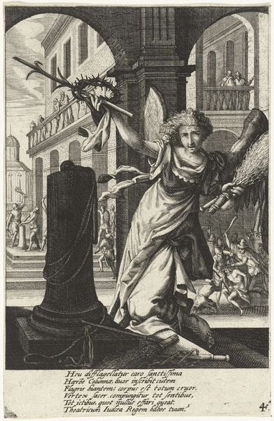 Abraham Hogenberg created this engraving, "Angel with a Glove and a Rooster," in the 17th century, a time of great religious and political upheaval in Europe. Hogenberg was working amidst the Reformation and Counter-Reformation. His prints often reflect the intense debates and conflicts of the time. Here, we see an angel who stands as a figure of divine judgment. The angel holds a gauntlet, a symbol of power and authority. The rooster perched above is a direct reference to the biblical story of Peter's betrayal of Christ; the crowd in the background appears to be mocking and jeering. The bag of spilled coins on the lower right is a stark reminder of betrayal and its consequences. The angel is barefoot, dressed in flowing robes, and gender ambiguous, so that they transcend simple binary definitions. The work invites us to consider the intersections of faith, power, and moral responsibility. It serves as a reminder of how historical and religious narratives are continuously reinterpreted through art.