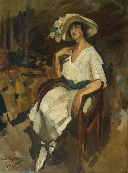 Editor: Here we have Konstantin Korovin's "Portrait of Z. Pertseva," painted in 1921. It’s an oil painting, and I'm struck by how the loose brushstrokes give it this sense of immediacy. What story does this portrait tell, particularly considering the period it was made in? Curator: It tells a story of material constraints and artistic innovation. Think about Russia in 1921: the revolution had just ended, resources were scarce. Look closely at the brushwork—it's rapid, almost frantic, driven by the necessity to conserve paint and canvas, maybe even influenced by the industrial energy around them.. This isn't the smooth, idealized portraiture of the Tsarist era. This roughness is evidence of how artists adapted under these material pressures, blurring the lines between fine art and the rapid pace of industrial production. Editor: So the materiality, even the sparseness, is key to understanding it? Curator: Absolutely. Consider the subject's clothing. Is it lavish? No. But there's an evident interest in capturing the texture of the fabrics with broad strokes. Even the jewelry—one single, yet detailed, ring—hints at lingering class markers being reimagined in the face of an egalitarian ideal. How might access to materials have dictated the kind of image Korovin created? Editor: That's a great point. Thinking about access and scarcity really changes how I see it. I was focusing on the face and thinking about her personality, but I now realize I was not examining how social upheaval dictated the materials. Curator: Exactly. Now you can start questioning who has access to art production and under what circumstances. Always look to the process; it's just as important as the finished piece! Editor: That's a really helpful framework to think about art. Thanks!