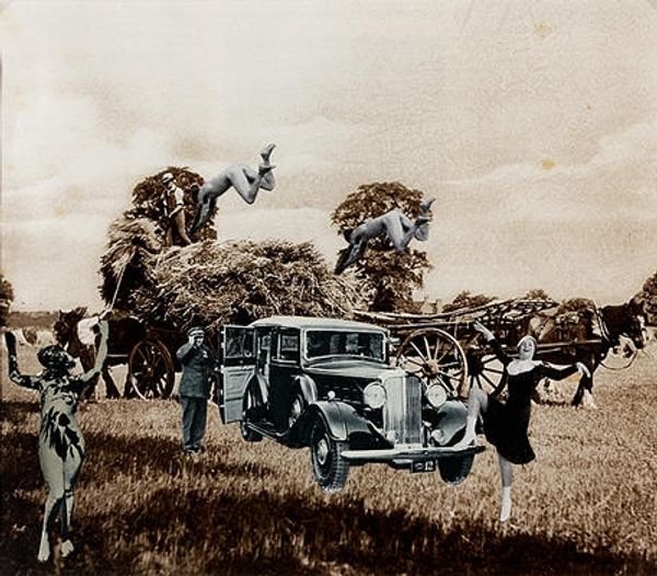 Rene Magritte made this painting, "The Anger of the Gods" with oil on canvas sometime in the mid-20th century. Look at the way he's brushed the paint so smoothly – it's almost as if he's trying to hide the fact that it's a painting at all. There's a kind of serene absurdity here. The textures are so subtly rendered that the horse and rider floating over the car, become almost believable. I love the way the light catches the horse's back, just so, and how the green of the car is echoed in the distant hills. It’s as if he’s inviting us to question the very nature of reality, but in a way that feels more like a gentle nudge than a shout. And that horse – it’s not just floating, it’s practically dancing! Magritte reminds me a bit of Giorgio de Chirico, another painter who loved to play with strange juxtapositions, but where de Chirico is all sharp angles and unsettling shadows, Magritte is softer, more inviting.