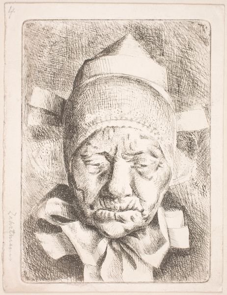 Kristian Zahrtmann created this etching, "Mor Thule," using the technique of etching, which renders a network of fine, deliberate lines. These lines sculpt the face of an old woman with striking immediacy. Notice how the etched lines define every wrinkle and fold, each line contributing to the overall sense of age and weariness. The artist employs hatching to build up the tones, creating depth and shadow that model her features, giving us a glimpse into the life etched onto her face. Zahrtmann seems to be playing with the symbolic weight of his subject. The title itself evokes Thule, a mythical, far-northern land, which suggests themes of isolation and endurance. This aligns with the formal qualities, as the starkness of the medium highlights the unvarnished reality of aging, challenging idealized portrayals. It invites us to consider how such visual choices challenge fixed notions of beauty and value.