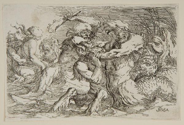 Editor: This is Salvator Rosa's "Combat of Tritons," an etching teeming with wild energy. The scene is a chaotic brawl; what do you make of all this swirling fury? Curator: It's a fantastic display of Rosa’s dramatic flair, wouldn't you agree? Think of the Baroque love for drama, amped up! These aren't your peaceful, decorative sea creatures; these are raw, untamed forces of nature locked in a primal struggle. One can almost hear the roaring sea! Editor: Yes, I see it now. It's not just a fight, it's a force of nature unleashed. Thanks! Curator: My pleasure. Rosa invites us to dive headfirst into the tempestuous depths of the imagination. Don't be afraid to get wet!
