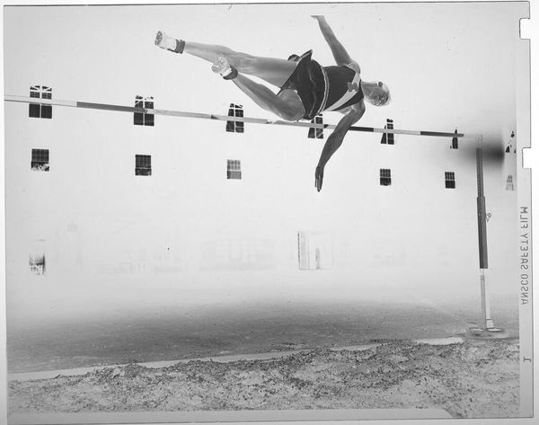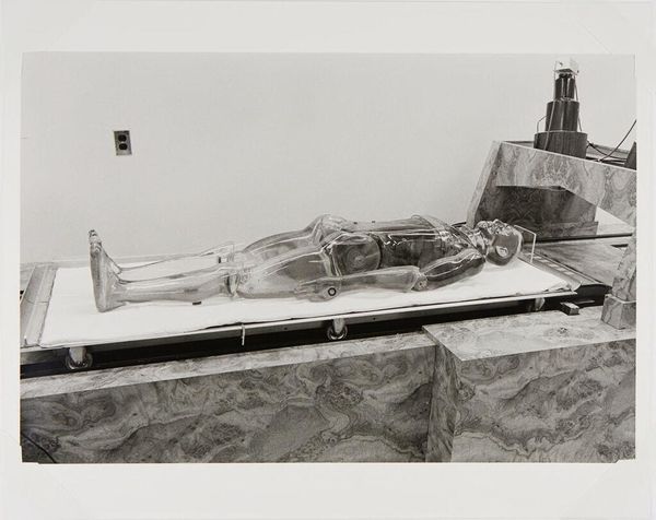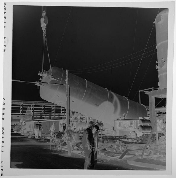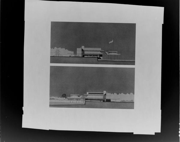 Robert Burian created this photograph of a helicopter and building, using a black and white film negative. The image captures a Marine helicopter suspended in air against the backdrop of an industrial building. Without knowing the precise date, the photograph evokes the Cold War era, a time when military strength and technological advancement were potent symbols of national identity and power. The helicopter, a machine of war and transport, becomes a charged emblem within this context. The stark contrast of the negative creates an eerie, unsettling effect, highlighting the machinery of military operations. It forces us to confront the complex relationship between technological progress and the human cost of conflict. The lack of title opens up the potential for individual interpretation, allowing viewers to grapple with their own feelings about military power, technology, and their place in society.