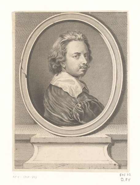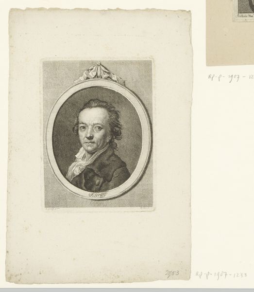 Curator: Today, we are looking at “Portret van Johann Heinrich Lips,” an engraving that comes to us from sometime between 1768 and 1817. It is currently held in the collection of the Rijksmuseum. Editor: My immediate impression is its quiet formality. The precise lines and smooth shading create a serene yet reserved mood. The neoclassical frame also adds to the overall sense of refined stillness. Curator: Indeed, this artwork's existence speaks to the engraver’s labor and the cultural value placed on portraiture during this period. Engravings like these democratized image production, making portraits more accessible. The image served to elevate the sitter through careful manipulation of line and tone, a skill that required extensive training and material investment, underscoring the commercial relationships involved. Editor: Speaking formally, I am drawn to how the circular frame guides the eye directly to Lips' face. The composition’s geometry – circle within rectangle – emphasizes the subject’s profile. The meticulous detail in the rendering of his hair and clothing showcases incredible artistic skill. The engraving relies on visual language that connects him to refinement and nobility. Curator: The widespread availability of portrait engravings also signals a new type of relationship with individual identity. Reproducing the image through engraving involved workshop economies. Consumption wasn't limited to wealthy elite alone and became connected with emerging middle-class status aspirations, driving the demand and transforming printmaking and distribution networks across Europe. Editor: What you bring up about production interests me – particularly how it differs so greatly from painting – even though there are moments of overlap in visual qualities. Considering the engraving technique allows an examination of how a single drawing is carefully copied across diverse impressions; each sharing core consistencies, yet bearing nuanced variation on the surface. These copies and iterations, and Lips' role, underscore something important about representation and replication that cannot be easily addressed by paintings or unique artworks. Curator: Looking at this work makes me ponder the relationship between Lips and the craftsman that day; their negotiation of visibility, circulation, production, and consumption. Editor: And I see how carefully considered formal structures grant this work its captivating presence.