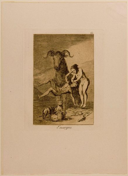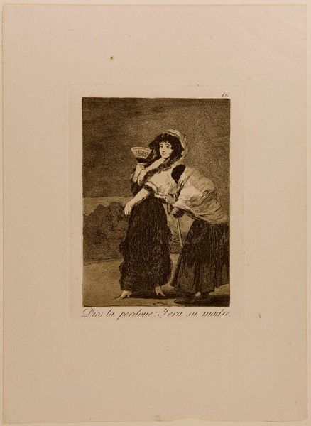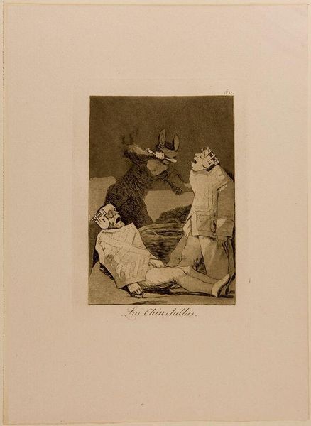 Curator: Francisco Goya's print, "Two of a Kind," now in the Harvard Art Museums, depicts a rather intriguing trio. What strikes you first about it? Editor: Well, it's moody, isn't it? All browns and grays, and the expressions on their faces—especially that older woman lurking in the background—it’s like peering into a whispered secret. Curator: It's part of Goya's "Los Caprichos" series, a collection of etchings that critique Spanish society and the follies of the time. Goya uses aquatint to create those tonal effects, giving the print its dramatic atmosphere. Editor: Follies indeed! You've got the dandyish gentleman, the flashy woman, and someone who looks like their conspirator. It whispers of corruption and decadence, but there is also a certain vulnerability in their eyes that makes you wonder. Curator: That’s Goya for you—never quite letting anyone off the hook, but always suggesting something more complex beneath the surface. He was quite the social commentator! Editor: Absolutely, and it makes you consider how societal critiques in art have always resonated, even centuries later.