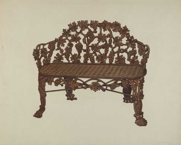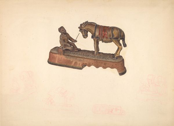 Curator: What strikes me first is its peculiar blend of vulnerability and strength. It evokes both a desire to protect and a sense of inherent resilience. Editor: Yes, that duality is quite compelling. We're looking at Frank Fumagalli’s "Dog Statuette" from around 1940, rendered with pencil, watercolor, and charcoal. There’s an undeniable visual tension, a dialogue of sorts, between its realism and the surreal impression the fur creates. Curator: Absolutely. The fur, so meticulously depicted with what looks like individual strokes, suggests a kind of societal anxiety projected onto the domestic sphere. Dogs, especially during this era, became symbolic stand-ins for national identity, loyalty, and even anxieties about cultural purity. Does this "statuette," however humble in medium, also invite us to reflect on gender roles of the era, through, say, comparison to effigies of mother and child? Editor: An intriguing reading! I’m drawn to the technical accomplishment here, particularly how Fumagalli coaxes dimension from these media. Consider the rendering of light on the legs, for example, or the interplay between texture and the smooth planes that define the base. I'm wondering if it is intended as a sculpture drawing? The way he captured the light is magnificent and invites many questions. Curator: Well, such "mastery," or facility of reproduction should raise questions about visibility: who is able to represent and who gets represented. While visually impressive, its engagement with "realism," to echo your comment, may reiterate societal hierarchies between artists and subject. How can a seemingly harmless image reinforce exclusion in the visual regime? Editor: A valid point to reflect upon, considering it's a 20th-century piece, created perhaps on the precipice of shifts in thought. However, isn't the very choice of subject – a domesticated animal – a challenge to conventional hierarchies in art? Doesn't the interplay between light and shadow serve a purely formal purpose, drawing the eye across the artwork and highlighting its carefully considered composition? Curator: That could be, or perhaps the subject is just another token animal companion in this period, further reinforcing class and domesticity stereotypes. I think looking at the subject position the statuette is standing in also speaks to that larger cultural understanding. Editor: Perhaps the dialogue between our perspectives here mirrors some of those ambiguities within the artwork itself. Curator: Hopefully the visitor takes our perspectives here today as inspiration for continuing these reflections.
