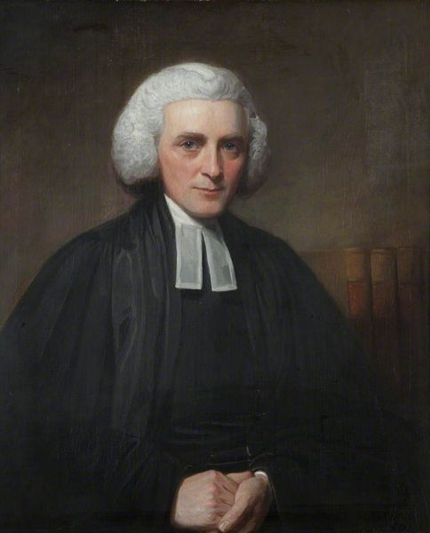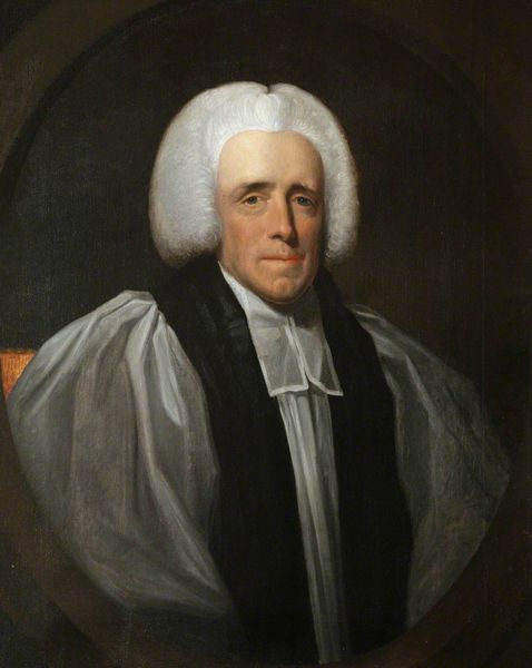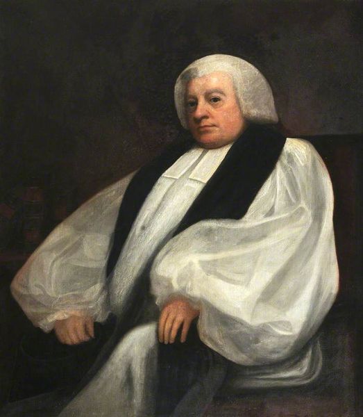 George Romney painted this portrait of Judge Sir John Wilson, using oil on canvas, with a focus on texture, color, and composition. The contrasting textures of the wig and robes draw the eye, while the color palette is restrained to browns, blacks, and whites, creating a sense of formality. Romney masterfully employs semiotics to convey Judge Wilson’s identity, with the wig and gown functioning as signs of his office and authority. The composition is carefully structured, with the subject placed centrally and framed by the dark background, enhancing the judge’s presence and conveying a sense of power. The visual weight and symbolic depth are carried by the texture of the wig. Ultimately, the portrait creates a visual language that speaks to the cultural codes and social structures of the time. It serves not just as a likeness but as a statement about the individual’s role and standing within the broader framework of eighteenth-century society.