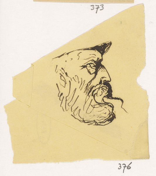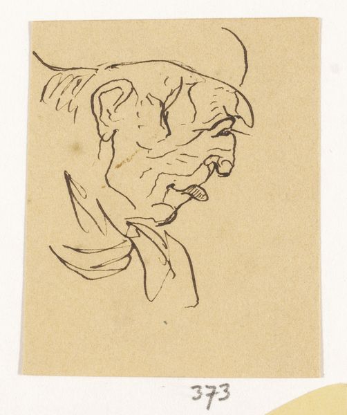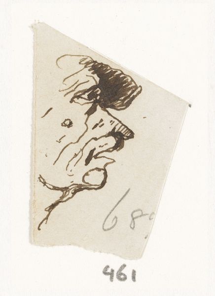 Johannes Tavenraat created this drawing, "Kop," using pen and brown ink on paper. The quick, gestural lines, reminiscent of a caricature, showcase Tavenraat's skill in capturing a likeness with minimal strokes. The brown ink, likely iron gall, has a fluid quality, lending a sense of immediacy to the drawing. The choice of paper as a ground is also significant; its absorbent surface allowed the ink to bleed slightly, softening the lines and adding depth to the figure's features. Consider the amount of labor involved in producing art materials during Tavenraat's time. From the harvesting of raw materials to the manufacturing of ink and paper, each element reflects a complex web of social and economic relations. Tavenraat's simple sketch, therefore, invites us to consider the broader context of artistic production and consumption in the 19th century. It reminds us that even the most modest of artworks are products of their time, shaped by material constraints and social forces.