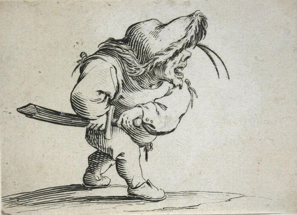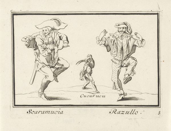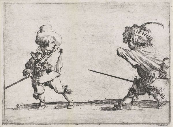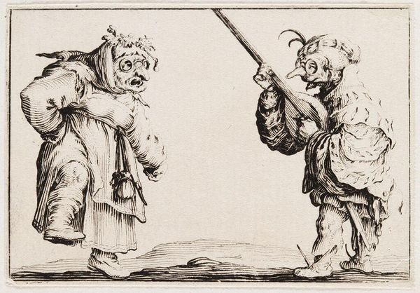 This is a print titled "Dancers with the Flute and the Tambourine," part of "Los Caprichos," and it presents us with an image of revelry and perhaps satire. The figures, grotesque and exaggerated, carry with them instruments of mirth. But let us look closer. The flute and tambourine, symbols of festivity, are here imbued with a disquieting energy. The figures' distorted features and frantic movements hint at something darker beneath the surface, perhaps a critique of societal excess. Consider the tambourine, an ancient instrument associated with ecstatic rituals and Dionysian frenzy. We see echoes of this in Renaissance paintings, where tambourines accompany Bacchic processions, embodying the loss of control and the sway of primal instincts. Observe too, the sword worn by both figures, a stark reminder of the ever-present tension between pleasure and violence. This opposition is not static. The evolution of symbols is fluid, and their resonance depends upon the cultural soil in which they are replanted. This image engages us on a deep, subconscious level, evoking a sense of unease and hinting at the cyclical nature of human behavior and the thin line between joy and madness.