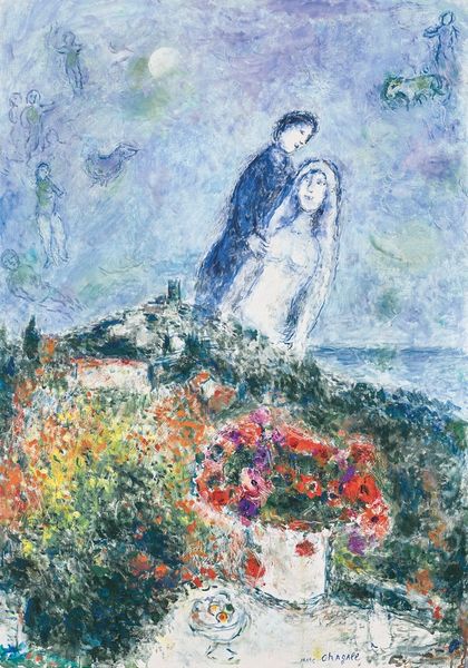 Editor: Here we have "Les mariés sous le baldaquin," or "The married couple under the Chuppah," painted by Marc Chagall between 1978 and 1980, using oil paint. The work immediately strikes me as celebratory, full of light, and with a certain dreamlike quality. What narratives do you see unfolding in this painting? Curator: Beyond the surface, consider Chagall's background as a Russian Jewish artist grappling with identity and exile. This painting presents the wedding canopy, or chuppah, as a symbol of not just marriage, but also of cultural continuity and resistance against historical forces aiming to erase Jewish traditions. The vibrant, almost Fauvist color palette counters the darkness of displacement with a bold declaration of presence. Editor: I see. It’s not just a happy scene but also a statement. Curator: Precisely. Notice the figures—are they merely individuals, or archetypes? How does the dreamlike, almost surreal quality contribute to a larger commentary on memory, homeland, and the surreal experience of being a cultural outsider looking in? Chagall often revisited personal history and folklore in his work; this painting embodies an interplay between private joy and communal resilience. What’s your take on the positioning of the violinist? Editor: The violinist seems central, almost levitating. Maybe art and music are portrayed as essential to upholding traditions? Curator: Absolutely. Music and art become acts of defiance and celebration intertwined. So, how does understanding Chagall's intersectional position—his religion, nationality, and artistic expression—shift our perception of the piece? Editor: It definitely adds layers of meaning, making the artwork less of a simple wedding scene and more of a complex story about survival and cultural pride. I will never see Chagall the same way. Curator: That’s the power of contextualizing art. It bridges historical understanding with personal experiences, making our dialogue with the work far more enriching.