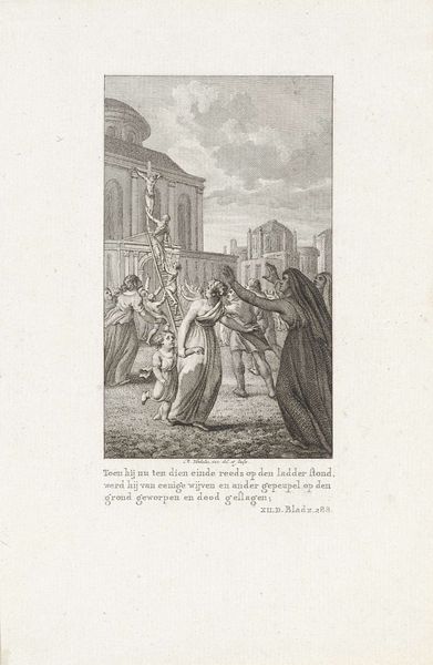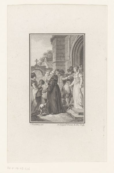 Editor: This engraving, titled "Paus Urbanus II te Clermont-Ferrand, 1095," is from the 19th century and portrays Pope Urban II. The crowd kneeling before him creates a rather somber tone. What strikes you when you look at this work? Curator: The kneeling figures certainly speak to a hierarchy of power, and how papal authority played out in the social order of medieval Europe. Consider this in relation to contemporary society. Does it spark connections with current debates about social hierarchies or leadership? Editor: That's an interesting question! It definitely brings to mind modern political rallies or even religious gatherings. The sense of reverence seems similar, but it feels different in the context of medieval power structures. Curator: Precisely. Now, consider the Crusades that Pope Urban II called for at Clermont. They were framed as holy wars, but were fundamentally tied to colonialism and the accumulation of resources. How do we grapple with this relationship between religious justification, colonialism, and the construction of power? Editor: So the image is not just a record, but a constructed representation of an historical event, deeply connected to colonialism and resource control? Curator: Yes, we can explore its relationship to current postcolonial discourse. The print can remind us to investigate whose voices are highlighted, whose narratives are obscured, and whose agency is denied by it. What do you think? Editor: Thinking about it that way really changes how I see the image. Instead of a straightforward historical scene, I am prompted to analyze the complicated politics behind it. Thanks, this was a perspective I hadn’t considered. Curator: Wonderful! It encourages a critical consideration of history. Hopefully it inspires further reflections on identity and social issues within art and society.
