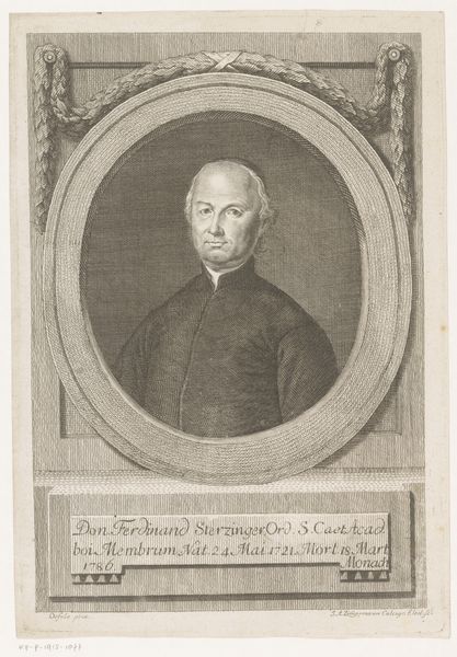 Curator: This engraving is a portrait of Ferdinand Sterzinger by Johann Michael Söckler, likely created between 1754 and 1781. It’s tempera on paper, a fairly typical medium for portraiture at the time. What strikes you first about it? Editor: It's very linear, rigid almost. There’s this austerity that seeps through—maybe it’s the collar, the monochrome palette, but he seems quite reserved, wouldn’t you agree? Curator: I find a quiet strength, a composure reflected in those fine lines. Engravings demand meticulous craft—the artist is literally carving an image into existence. Söckler captured not just Sterzinger's likeness, but the precision valued in Baroque portraiture. Think about the labor! Editor: Precisely, that act of carving... I wonder about the implications of that. Was there a specific kind of tool or training needed to translate what Oesfle made into an engraving on tempera? This engraving on paper brings Sterzinger's face to a wider public through reproduction, not unique expression, shifting from pure art object to consumable image. Curator: You're touching on something essential—engravings democratized images. The intent behind this particular piece, it feels commemorative. Sterzinger, as the inscription details, was a theologian, a professor of law, a member of the Bavarian Academy of Sciences, and director of historical studies, celebrated for his intellectual rigor and service. Editor: Exactly! To make something enduring through an industrial reproduction—what message were they hoping to send? By focusing on replicating, it raises a fascinating dialogue. Curator: For me it still remains quite special – Söckler allows Sterzinger’s inherent intelligence to shine through; one feels as though they are truly looking at him, instead of a replication. He certainly held much merit and importance for Söckler. Editor: True, he becomes more of a three dimensional subject to me through your words, despite being on paper. Curator: Considering our talk of the labor, material and emotion intertwined with this image, it makes me look with more reverence! Editor: Definitely food for thought - for both of us!
