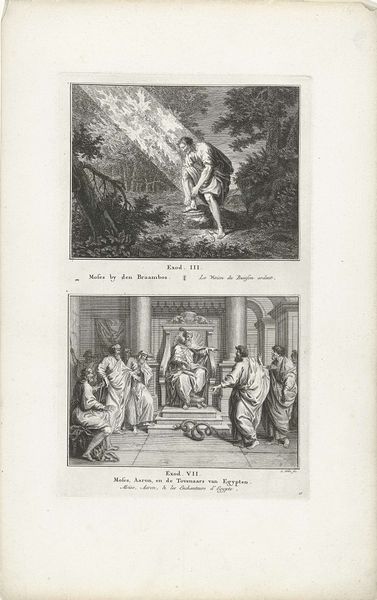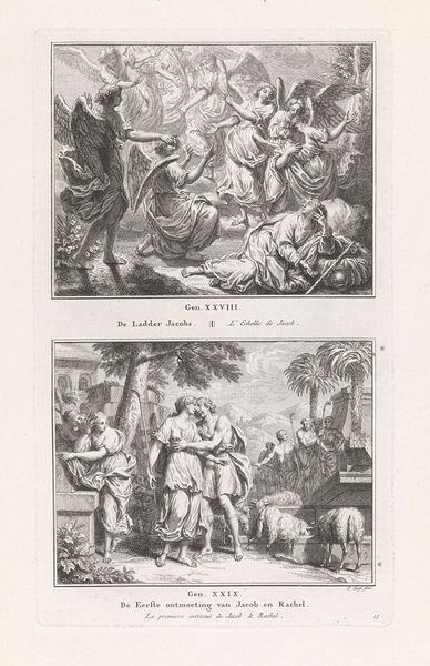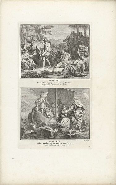 Editor: This engraving by Jacob Folkema, dating from 1791, depicts two scenes: "Elia door de raven gevoed en Obadja voedt honderd profeten in een grot." The rendering is quite detailed. What strikes me is how different the two stories are compositionally, the top feeling more open and the bottom quite enclosed. How do you interpret this work? Curator: You've noticed the key distinction. Let's consider the raven first. Throughout history, it has symbolized many things: prophecy, intelligence, but also death. Notice how the artist has chosen to depict it here, carrying nourishment. What does that reversal suggest about the role of divine intervention? Editor: So, the artist is using the raven as a visual cue, saying that even a symbol of death can be an instrument of God? Curator: Precisely! And below, the scene in the cave. Think about the cave as a symbol itself: refuge, the womb, a place of hidden knowledge. Obadja's feeding of the prophets is about preservation, of not just life, but of faith. It's intentionally darker, representing that which is hidden. It's quite powerful, how Folkema uses contrasting spaces to convey these complex biblical narratives, don't you think? Editor: Absolutely. Seeing those contrasting symbolic spaces really clarified how much the visual language enhances the storytelling here. I had missed all the nuances at first glance! Curator: Visual symbols build shared understanding. Think of them as cultural bridges, connecting us across centuries, to stories and beliefs that continue to resonate. This engraving is a wonderful reminder of how artists employ these bridges to deliver meaning.