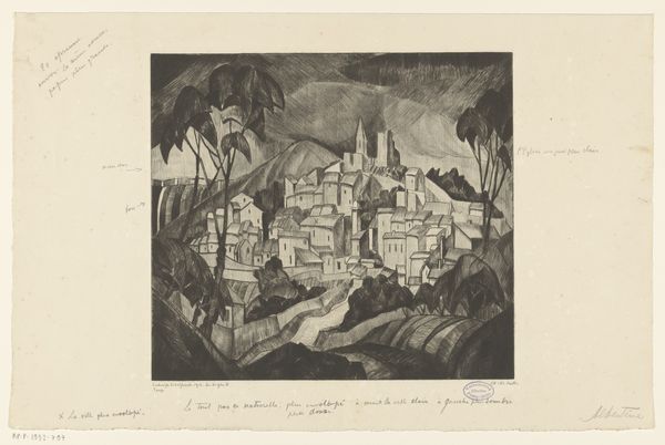 Curator: Lodewijk Schelfhout’s etching and print, entitled “Avignon,” created in 1918. Editor: There's an immediate graphic starkness to this. The sun bursts above a stylized cityscape, it feels both ancient and newly industrial all at once, a somewhat unsettling beauty. Curator: Indeed. Schelfhout, working in the early 20th century, positions Avignon within a pivotal historical context, doesn't he? He uses printmaking – itself a democratic medium – to reimagine traditional landscapes. I wonder what socio-political meanings we might find here. Is this post-war, pre-war? What does this location symbolize in France? Editor: I am curious how the print as a medium here is relevant to our ideas of identity and politics in imagery? Are we talking about the people, are we looking at how they shape the buildings and landscape, or is it something about progress itself. It almost looks geometric. It does seem relevant for after WWI and how we think of this destruction. Curator: Printmaking does allow for widespread dissemination, connecting it directly to the public's access to art and information. Consider the rise of mass media. Are the geometric shapes references to modernist ideals or perhaps hinting at fractured social structures post conflict? The way the landscape is depicted with precise lines might symbolize an effort to rebuild society along rational lines. Editor: Yes, that visual structure gives me some pause. Does it invite accessibility for everyone? If that’s the message, why is there an inherent bleakness that still shines from the piece, if light and day is attempting to move forward through societal constraints? Curator: I think your interpretation hints at a deeper contradiction within modernist projects. A vision that often promoted universality while often overlooking the nuanced experiences of marginalized communities. Schelfhout presents a beautiful image but not necessarily an inclusive one. It encourages dialogue regarding gender, race, and politics because in many ways the beauty is only one dimension. Editor: Absolutely. Considering the political climate and what art becomes afterward, is there some sort of optimism through that message? So, instead of completely feeling like the piece exudes societal constraints, perhaps the print's aesthetic appeal invited discourse on this rebuilding of the mind. Curator: Precisely, that nuanced tension is the piece's power, isn’t it? It's a testament to how artworks become a cultural battlefield for our ideas. Editor: Exactly. Well, that adds another layer for us to discuss while we move into a new chapter. Thank you for these insightful perspectives.