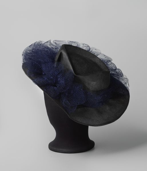 Curator: Looking at this confection of black fabric, I’m immediately transported. It's intensely velvety and almost gothic. There's something about the deep, dark, delicious tones and soft textures that hints at clandestine assignations! Editor: Indeed. What you're seeing is an Evening Bonnet, created somewhere between 1890 and 1894. You can find it here at The Met. It's primarily textile and fibre art, showcasing that late 19th century flair for dramatic accessories. Curator: Accessory feels far too mild! This bonnet feels like a character in a play! The large floral element feels a bit decadent; the dark velvet petals contrast with a coarser woven base. The ribbons seem less to secure than to entice a closer look at the nape of the neck…! Editor: The late 19th century was an interesting period for social expression through fashion, and mourning became almost fetishized in public life, especially after the death of Prince Albert. Queen Victoria modeled the sophisticated sorrow everyone else scrambled to replicate! What better way than in wearable and wildly elaborate garments? Curator: Ah, the Victorian era and its controlled exterior masking all that…everything! The materials used speak volumes too. Velvet for richness, woven fibre for grounding. This headpiece embodies constraint AND exuberance. Imagine the personality needed to carry this off! A secret poetess, perhaps, or a stage actress escaping into shadows? Editor: Bonnets such as this one often served a purpose beyond mere decoration. They demarcated social status, reflecting women's positions and sometimes aspirations within a structured society. Also, the use of mixed media within the costume marks a democratization of materials – mixing luxe textiles with more common materials like simple weave. Curator: Democratization by way of delicious gloom! But yes, it also reflects a broadening of taste, wouldn't you agree? Even, perhaps, a subtle rebellion against rigid high society dictates? Editor: I do. And speaking of broadened tastes, these designs opened employment for legions of women—professional milliners, textile artists, seamstresses—fashion became a field to infiltrate, beyond being merely something dictated from above. Curator: So this bonnet really is a potent little time capsule, encapsulating both mourning and the dawn of something fresh. Who knew fashion could hold so much history? Editor: And on such a small head! This Evening Bonnet tells tales not just of what women wore but how they carved a space for themselves, stitch by shadowed stitch.