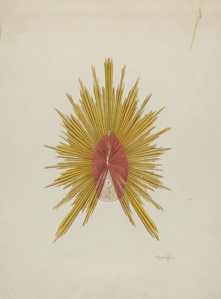 Curator: I'm immediately struck by the color palette – this sunny yellow backdrop contrasting with the blue floral motifs feels simultaneously cheerful and delicate. Editor: You’re right, there's a gentleness to it. Let's take a closer look. We're looking at "Collar (For Child)," a drawing executed around 1939 by Ann Gene Buckley. It’s composed of watercolor and colored pencil on paper. Curator: A collar design! Fascinating. Collars throughout history have signified rank, piety, even resistance. Think of Queen Elizabeth I’s ruffs, or the detachable collars of the suffragettes. A child’s collar, though, speaks to something softer - innocence, adornment, belonging to a particular family aesthetic. Editor: Intriguing, to read that societal weight into a child's garment. Structurally, what interests me is the almost abstracted botanical arrangement. The blue petals— are they flowers? Shells? —cascade down a yellow expanse. It’s representational but also pushes towards pattern, design as pure visual pleasure. Curator: Shells would be particularly poignant. The shell represents pilgrimage, protection, even resurrection in some symbolic systems. Placing a child under that kind of visual aegis would be deeply meaningful, maybe unconsciously. Editor: And see how the shapes interact. The scalloped edges of the larger garment form an echo in the individual shells or flowers, a continuous play between line and form. What is also very striking is the way this artist uses colour to fill or shade the blue of these petals in a flat way so it really enhances the whole garment.. Curator: Absolutely, this is not just decoration. I wonder what childhood in 1939 meant— on the cusp of immense historical upheaval. A collar like this might have served as a visual anchor to a time of relative calm. It carries both tenderness and an echo of fragility, which is maybe what gives it the particular emotional tug we feel. Editor: The simplicity of the technique—watercolor and pencil—further underscores that delicacy. Thanks to this visual parsing, this piece invites us to ponder those historical touchstones alongside personal ones and see something altogether new in the design itself. Curator: Yes. And hopefully encourages viewers to examine the subtle emotional language we use to surround and protect our children, consciously or not.