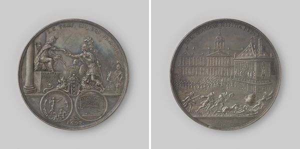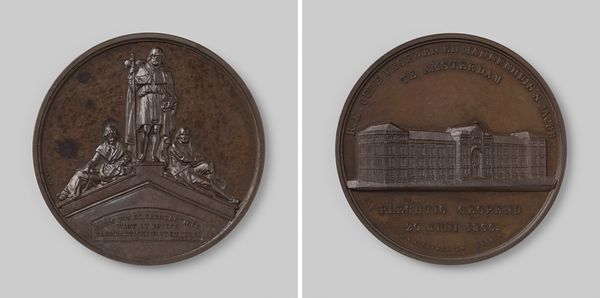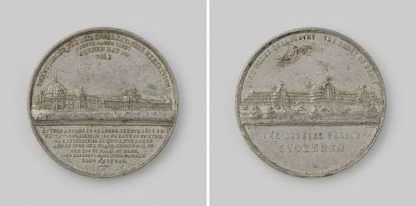Editor: Here we have a bronze relief from 1855 by Armand-Auguste Caqué, titled *Wereldtentoonstelling in het Palais de l'Industrie te Parijs, ter ere van Napoleon III, keizer der Fransen* – or, in English, *World Exhibition in the Palais de l'Industrie in Paris, in honour of Napoleon III, Emperor of the French*. It feels almost like a commemorative coin, you know? What's your read on this? Curator: A coin indeed... but far more grand, don't you think? Imagine it resting in the palm of your hand – the weight of history, the gleam of ambition. For me, it whispers of Napoleon III's vision for France. He wanted Paris to be *the* center of culture and innovation, a modern Rome, and this World's Fair, documented here, was key to his plan. Editor: That makes sense. I was also thinking of classical sculpture. Those figures on one side really resemble Greek goddesses. Curator: Exactly! It's fascinating how Caqué is tapping into classical ideals to legitimize Napoleon III's regime. The figure in the center, arms outstretched... could she be a personification of France, maybe even a deliberate echo of Liberty? Are those rays emanating from her head, like a sun-king figure, suggesting divine right? It's all so deliberately constructed. Editor: It feels like it’s saying, "See? We're just as impressive as the ancients, but, you know, *modern*!" It almost makes me laugh, that level of aspiration. Curator: (Chuckles) Aspiration bordering on self-deception, perhaps? But isn't that often the engine of progress? It’s more than decorative art, it’s propaganda cast in bronze. Editor: So, a little bit classical, a little bit industrial revolution... I think I'm seeing this piece with completely new eyes now! Curator: That's wonderful! The piece lives anew. A bit of ancient Greece meets a Napoleon…quite a fascinating date for history.