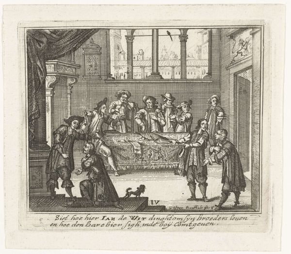 This engraving, made by an anonymous artist in 1672, depicts Johan de Witt pleading for his brother's life. The scene is dominated by the figures of men in dark clothing, surrounding what appears to be a judicial table. Notice the symbolic gesture of supplication. This posture, with hands clasped and a kneeling figure, echoes across centuries, from ancient Roman oratory to Renaissance depictions of biblical scenes. Here, it embodies the desperation and urgency of de Witt's plea. But, consider how this gesture, rooted in humility and vulnerability, becomes a potent tool of rhetoric. In other contexts, it might represent genuine remorse, but here, it serves a strategic purpose within a charged political landscape. The artist suggests how deeply ingrained cultural symbols can be manipulated, their original meaning twisted to serve contemporary agendas. This image resonates with the eternal human drama of power, loyalty, and the precarious nature of justice, engaging us on a subconscious level with its raw emotional intensity.