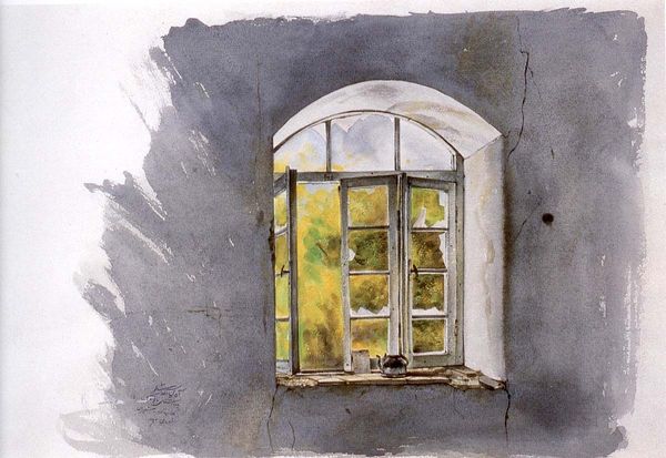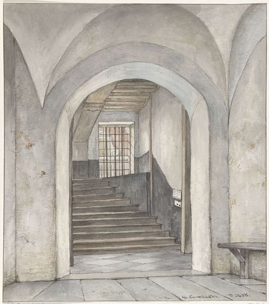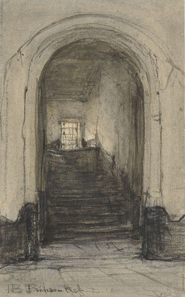 Curator: Carl Bloch, most recognized for his religious scenes, surprises us with this watercolor and charcoal drawing entitled "En munkecelle," or "A Monk's Cell," created sometime between 1790 and 1890, currently held here at the SMK. Editor: It evokes a sense of isolation. The stark contrast between the light flooding through the window and the gloom of the cell really sets a somber tone. Curator: Notice how the composition directs the eye. The framing arch of the window mimics the arch of the cell's opening, leading us to the source of light and perhaps metaphorical enlightenment. Editor: What strikes me is how much the labor of the monastic life would center on these sparse, readily-available materials. Look at the textures he coaxes out of charcoal and pigment. I can practically feel the damp chill of the stone. Curator: Indeed. The almost photographic realism contrasts beautifully with the Romanticism that informs the emotional undercurrent. The lack of narrative is striking. Where are the figures normally inhabiting Bloch's compositions? Here, it's only architectural presence. Editor: Perhaps that’s the point—we're meant to consider absence, labor. The texture, for instance—it is all surface with subtle manipulation: that invites questions about value and the processes it documents. Is this drawing more than just a preparation for a larger project, like some artifact of monastic labour itself? Curator: That perspective gives depth to its purpose beyond mere aesthetics. Looking at it from your perspective offers, perhaps, more complexity to unpack concerning societal expectations around creative work. Editor: Exactly. It moves beyond pure depiction, making us question the role and depiction of that world, as opposed to passively consuming yet another historical recreation of it. Curator: Thinking of those broader socio-economic dynamics really makes one reappreciate how carefully Carl Bloch constructed not just an image but a context. Editor: Right, this has altered my understanding of this piece significantly and offered much needed layers of meaning. Thank you!
