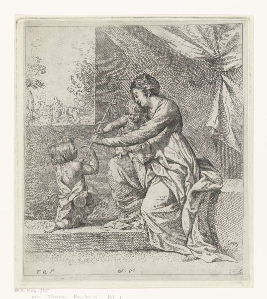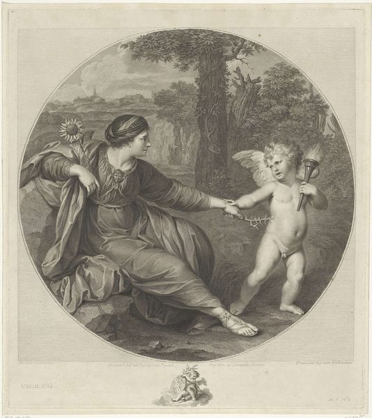 Curator: This is Francesco Bartolozzi's "Clytie." It's a stipple engraving, capturing a mythological scene, now residing here at the Harvard Art Museums. Editor: It has this melancholic air, doesn't it? Like a memory fading at the edges. The woman is regal but somehow resigned. Curator: Yes, Clytie was a nymph who loved Apollo, the sun god. Her unrequited love led her to watch him endlessly, transforming her into a sunflower, always facing the sun. Editor: The sunflower! Such a potent symbol of longing and devotion. And there’s Cupid, offering a thorny vine. Is he offering love or warning her about its sting? Curator: Perhaps both. Bartolozzi's work often plays with these ambiguities, contrasting classical beauty with human frailty. It reminds us that even divine love can lead to sorrow. Editor: It makes you think about what we choose to fixate on, and how that shapes who we become. Curator: Exactly. It’s like love and obsession blurred into a single, heartbreaking image.