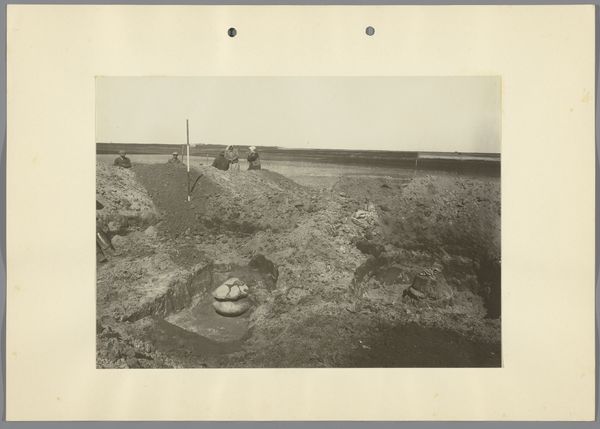 Editor: Here we have Carl Wilhelm Bauer's "Gezicht op het graven van een funderingsput ten behoeve van de bouw van een schutsluis ten westen van Terneuzen," a photograph, probably taken sometime between 1901 and 1920. The tone is overwhelmingly bleak. What kind of social commentary might Bauer be trying to offer through this depiction of industry? Curator: This image speaks volumes about early industrial impact. Notice the scale of the excavation. It's almost alienating, dwarfing the figures observing the machinery. Considering this was taken in the early 20th century, what social and economic changes do you think were influencing Bauer’s perspective? Editor: Well, the Industrial Revolution was transforming society. I imagine rapid urbanization, wealth disparities, and anxieties about technology were very prevalent themes at the time? Curator: Exactly. Bauer's work provides visual evidence of these shifts. Consider the composition. The harsh lines of the pit contrast starkly with any semblance of natural landscape. Do you think this composition conveys a sense of progress or something more conflicted? Editor: I lean towards conflicted. The massive pit and the rudimentary technology give off an unwieldy impression, and seeing all those felled trees, you realize it is literally carved out of the earth, so maybe it implies that progress has a cost. Curator: Precisely. And it's crucial to question whose progress this truly is, who benefits, and who pays the price, because marginalized groups are often the first to suffer negative consequences. It urges us to reflect on similar issues facing us today. Editor: I had not thought about it this way. It reframes the whole picture. Thank you. Curator: Of course. Art like this forces us to engage in important dialogues about humanity, labor, and the environment.
