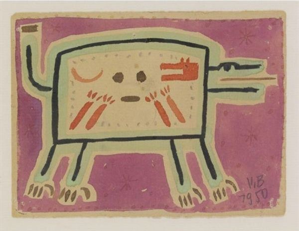 Curator: This is "Go-Go," a print created by Will Barnet in 1947. Editor: It's... arresting. The figure has this raw, almost primal quality. The bold blocks of color are intense, and the whole composition is quite flat. It reminds me a bit of folk art, perhaps from the early 20th century. Curator: Exactly! Barnet’s work from this period grapples with figuration and abstraction, a dance informed by both personal and global anxieties following the Second World War. You can almost feel the tension between wanting to represent the familiar, like a mother and child, and a push towards something more emotionally symbolic. Considering his engagement with the anxieties of his time is really pivotal here. Editor: It's the material reality that grabs me, actually. This isn't some photorealistic depiction meant to fool the eye. It's printmaking; the limitations of the medium are right there in the simplified forms and distinct colors. Each layer and its impact. One considers his method, process and access to resources while studying Barnet here. The choice of print suggests accessibility, even a democratization of art. It makes me wonder who this Go-Go doll was originally designed for. Was it a product of wartime constraints or an effort to create art for everyone? Curator: That emphasis on accessibility resonates deeply when you consider the cultural and political landscape. Post-war America saw shifts in gender roles and societal expectations. What would that toy represent in relationship to the larger movement? Editor: True, and look at the colors! These are inexpensive pigments, commercially produced and distributed. No fancy oils or artisanal pigments here. The material shouts about its humble origins, almost a rebellion against the art establishment. Curator: It's as though Barnet is forcing us to reconsider our own notions of value and beauty, isn’t it? The doll takes on even more resonance. "Go-Go," who, I wonder? Editor: Exactly. "Go-Go" also makes one consider issues of race and consumerism within post-war U.S., with mass toy production rising...what commentary on these topics does he hope to make available in this work? Curator: "Go-Go" might invite multiple considerations of accessibility, representation, identity. Editor: Indeed, a print made accessible with humble materials and methods provides a poignant study!