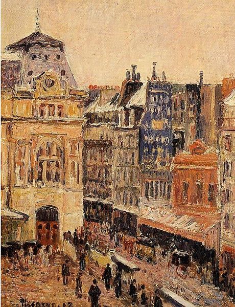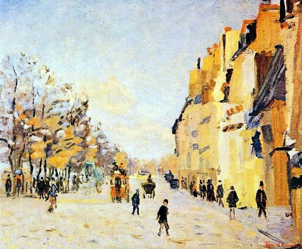 Camille Pissarro painted 'Rue Saint-Lazare under Snow' with oil on canvas, its dimensions modest at 27 by 35 centimeters. The scene is dominated by a palette of muted browns and greys, mimicking the somber atmosphere of a snow-laden Paris street. Pissarro disrupts the conventional landscape by emphasizing the architectural structures over natural elements. Notice how the buildings aren’t just backdrops; they rise vertically, asserting the urban space. The brushstrokes, short and fragmented, don’t blend but remain distinct, reflecting an interest in the materiality of paint itself. This technique obscures fine details and edges, conveying a sense of immediacy. The dense strokes challenge traditional notions of space, creating a surface that feels both flat and deeply textured. This approach invites us to consider how Pissarro redefines urban representation, seeing it less as a picturesque scene and more as a field of visual experimentation.