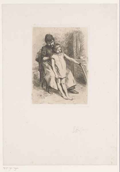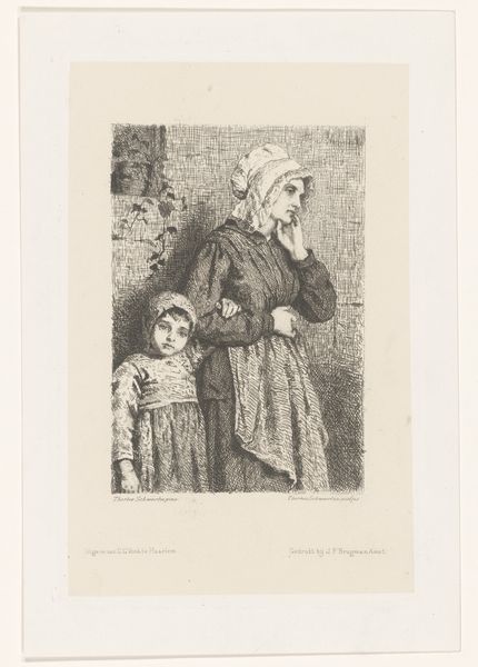 Editor: We are looking at "Twee meisjes," or "Two Girls," an etching by Willem de Zwart from around 1896. I'm immediately struck by how intimate and yet unresolved the image feels, a result I think of the contrast between the darker, busier figure in the background and the quieter profile of the girl. How do you interpret this work through its formal elements? Curator: A productive line of inquiry. Note how the composition hinges on a dichotomy. The texture created by the etching process generates visual density on the left; the use of cross-hatching to suggest depth and shadow overwhelms the image of the woman while simultaneously providing contrast to the starkly lit, more linear depiction of the girl. What structural relations emerge for you when considering the relation of darkness and light, figure and ground? Editor: I see that the darker figure almost blends into the background, whereas the young girl really pops, her face being light, especially when compared to the collar area the woman’s hand is adjusting. The composition then directs our attention primarily to the young girl. It's an etching, so the use of lines is essential. How does that impact the figures' placement within this plane? Curator: Observe the density of lines creating texture and tone. This, in turn, defines spatial relationships. Linear precision yields to tonal density, almost obscuring parts of the female figure and thereby modulating our attention, precisely as you noted, on the form of the girl. One may inquire into the geometry that emerges, or consider how each structural element guides the viewer's gaze. How is meaning generated through such strategies? Editor: This has helped me see how de Zwart is very much guiding how the work should be seen through light, composition, and tone. I better understand his intention for creating these figures with purpose, specifically in relation to the other figure and ground within this medium. Curator: Precisely. Focusing on line, form, tone, and structure permits a close reading that is always revealing, and such focused viewing can give insight on many levels.